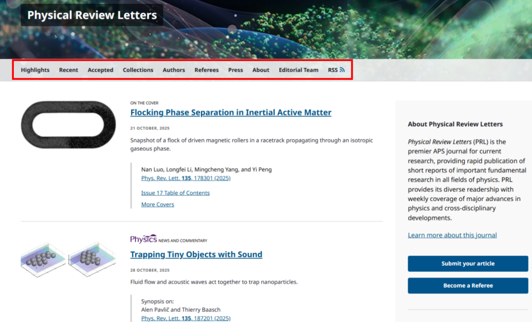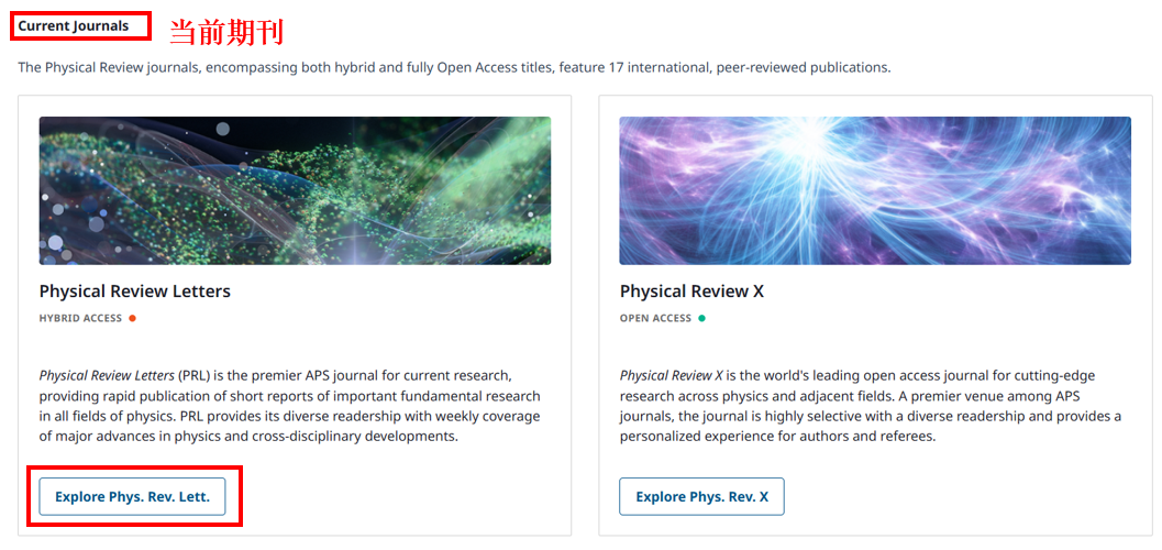 在当前期刊部分,可以浏览期刊的简介,点击下方“Explore Phys.Rev.Lett.”即可进入期刊详情界面。