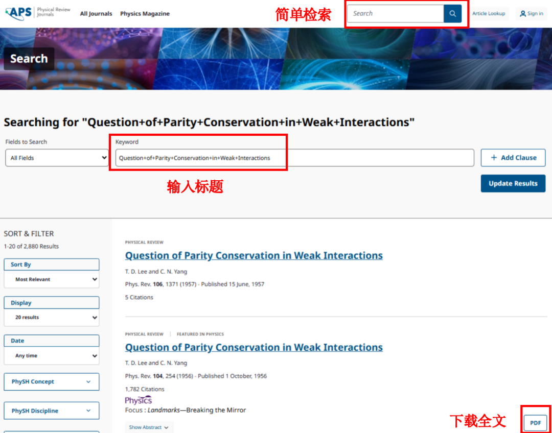 例如你想获取这篇文献的全文,且知道论文标题为“Question of Parity Conservation in Weak Interactions”,那么可以直接在APS数据库首页右上角的搜索框中输入标题“Question of Parity Conservation in Weak Interactions”,点击检索。