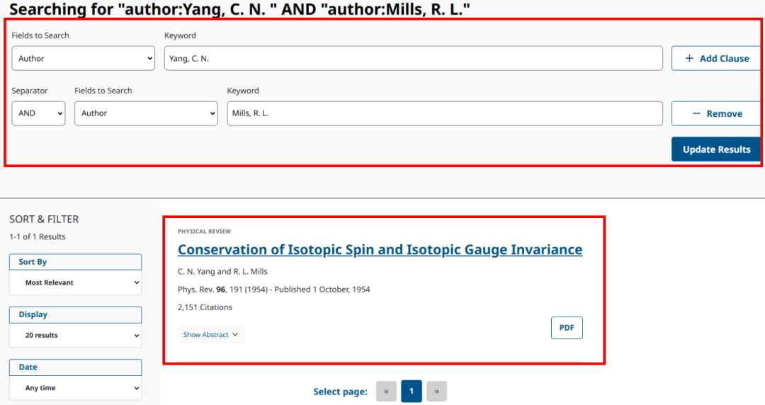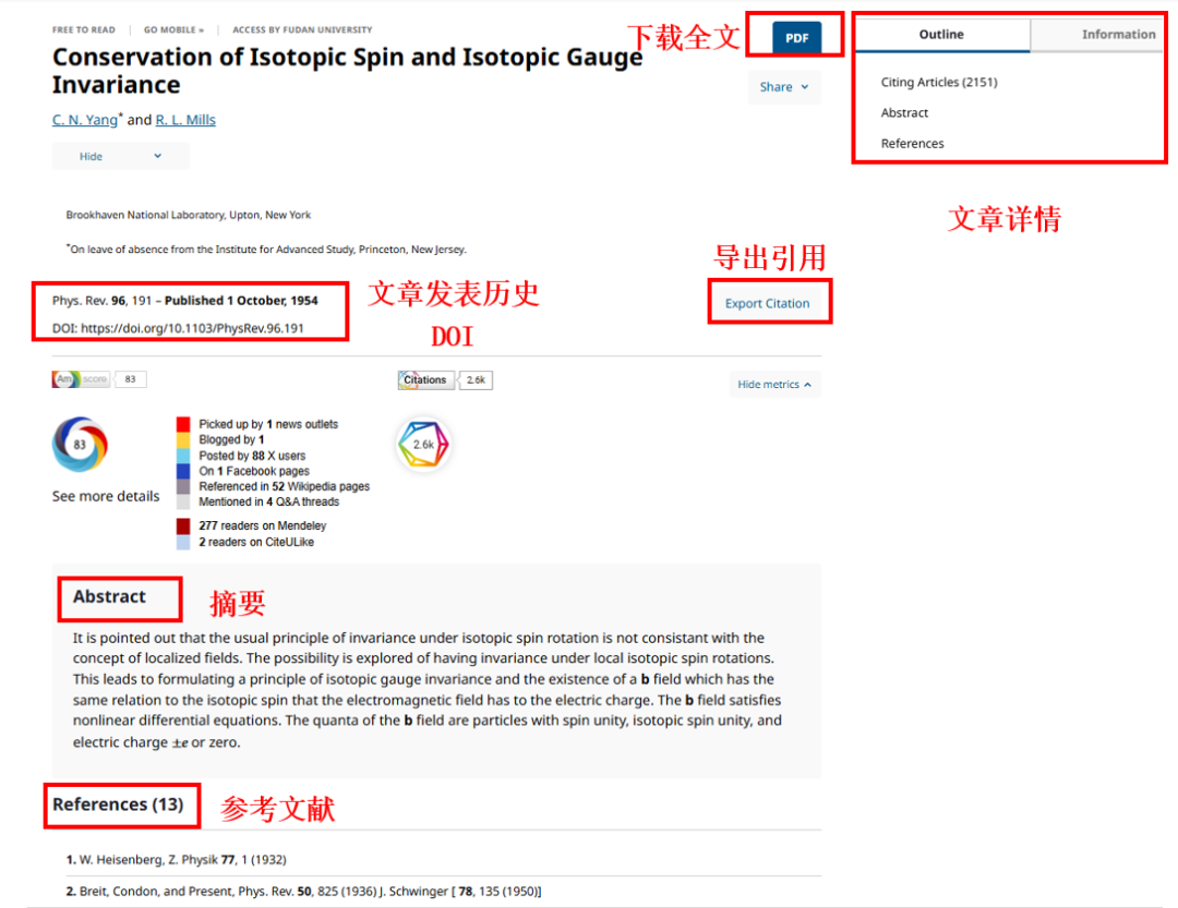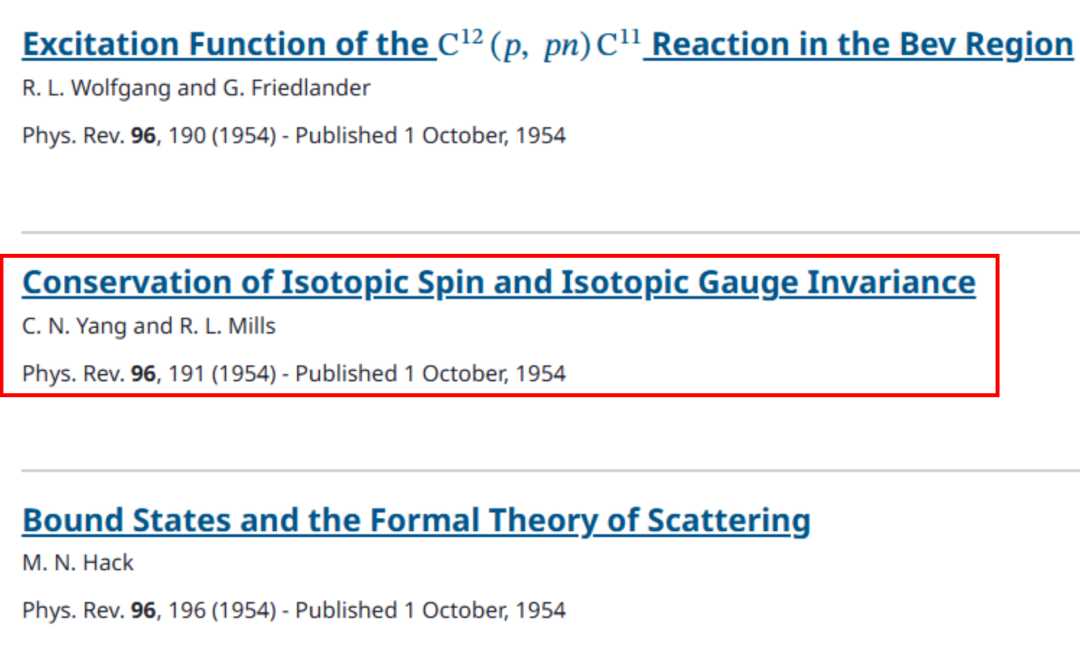 例如你想获取这篇文献的全文,且只知道“Yang, C. N. AND Mills, R. L. Phys.Rev. 96,191 (1954)”这些信息,那么可以使用高级检索、浏览检索或者文章定点查找获取全文。
