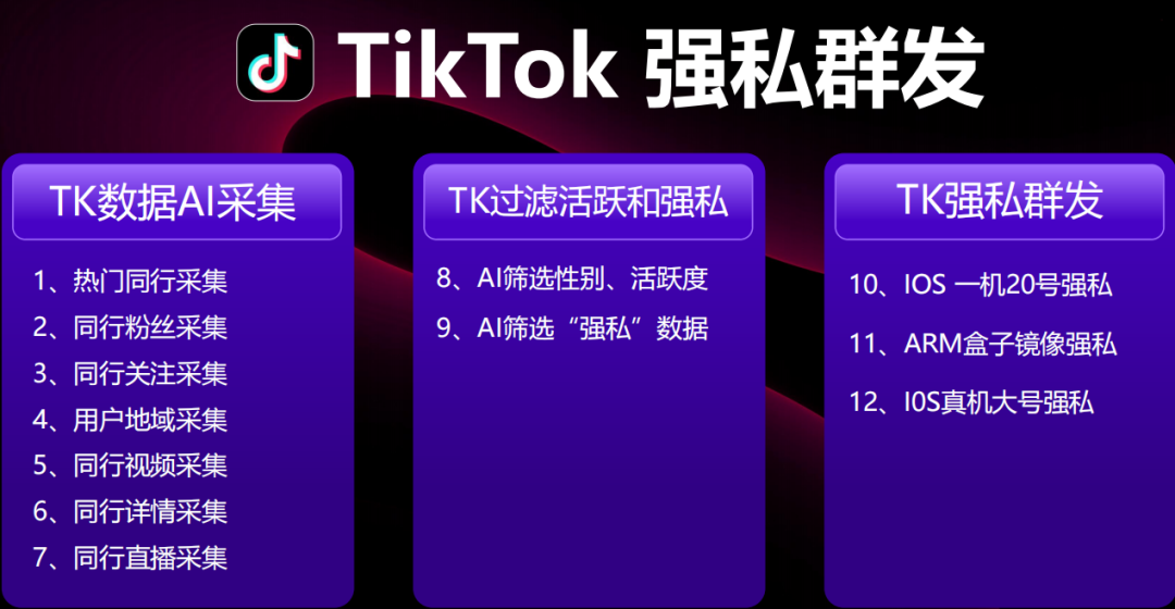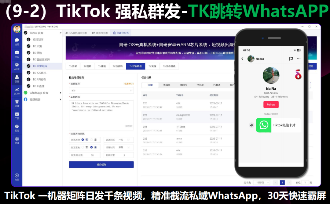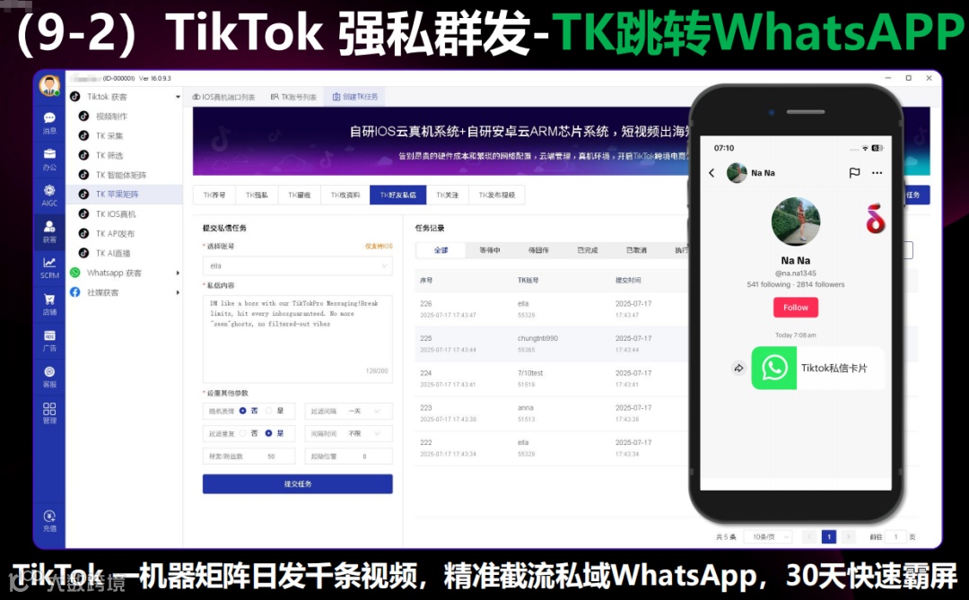 TikTok垂直养号 → AI采集 → 强私触达 → WhatsApp承接成交。