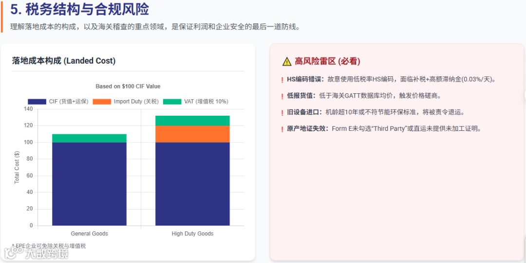- 优惠:凭中国签发的Form E原产地证,多数普通货物可享0%关税。