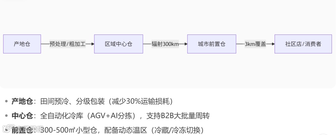 - 终端门店:社区前置仓或店仓一体,辐射范围3–5公里。