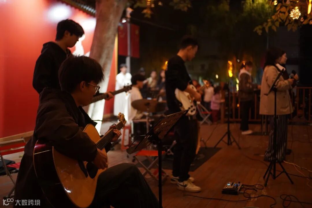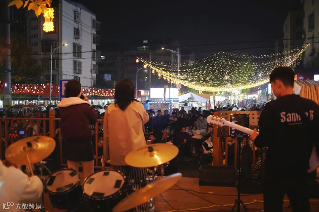 夜市北端的小舞台上,共建高校徐州工业职业技术学院“纯蓝乐队”带来的现场表演,将活动氛围推向高潮。《不再犹豫》《鲜花》《真的爱你》等曲目轮番上演,热血旋律与温柔曲调交替,与摊位前的谈笑声、锅铲碰撞声交织成独特的夜市交响。“边听喜欢的歌边吃美食,这种氛围太治愈了!”参与活动的青年小李说。原本陌生的青年们随着节奏轻哼,在分享校园趣事、交流美食攻略中逐渐熟络,让夜市成为青年社交的新场景,进一步拉近了青年与城市的心理距离。