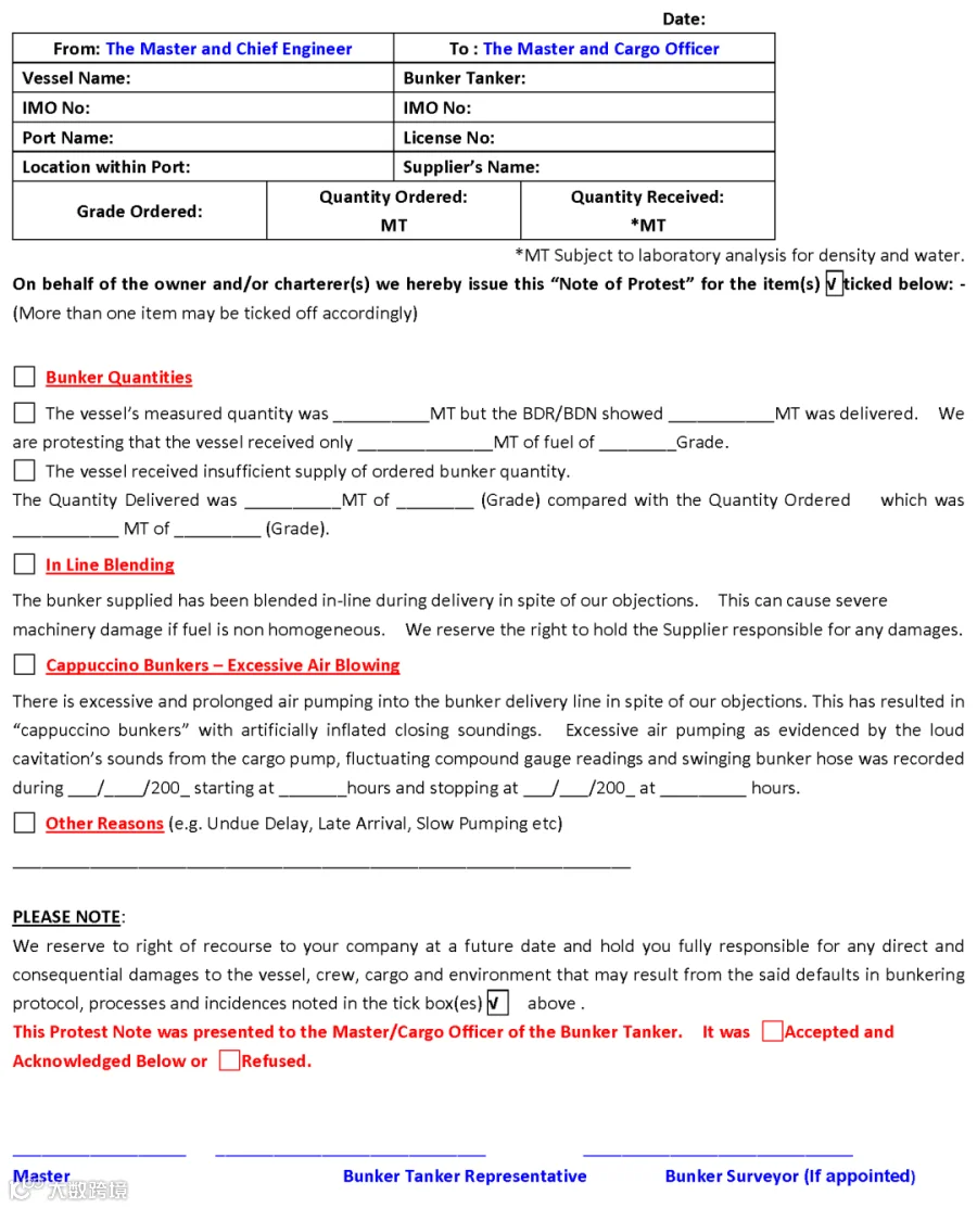 若存在数量或质量争议,应立即与供应商重新测深并书面记录差异;差异≥0.5%时,签发《TOM 55 抗议书》,并抄送船东、租家及管理公司[k]。