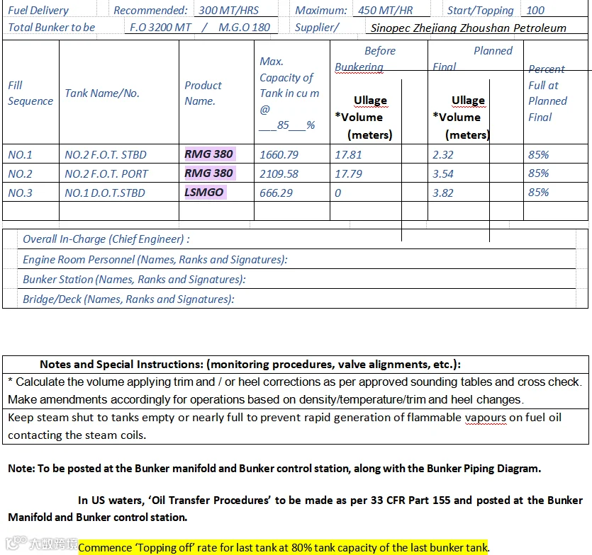 记录驳船初始液位及本船各油舱初始空高或体积,双方签字确认;约定“顶满”停止信号(如灯光或VHF通知)[k]。