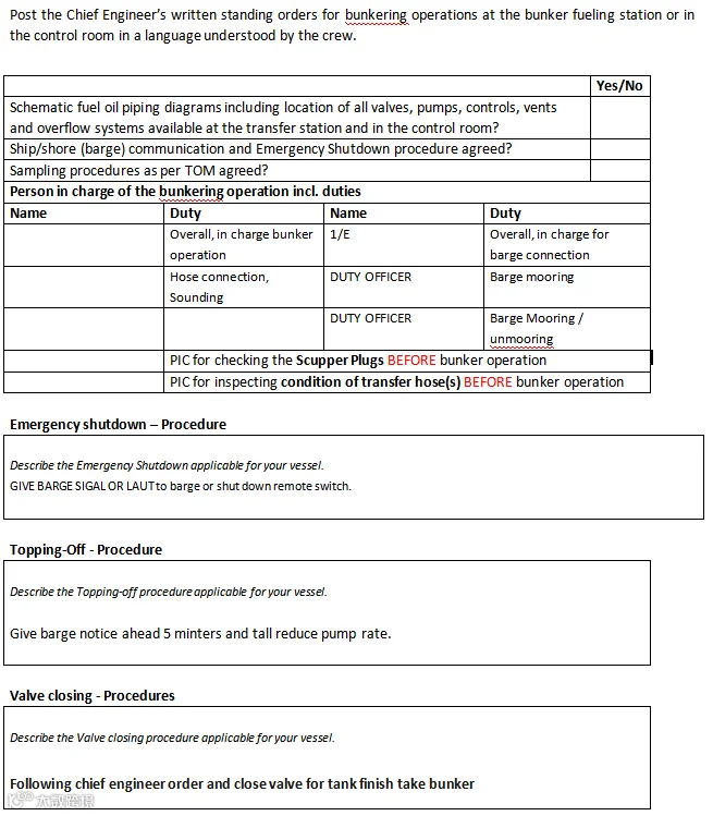 制定《加油计划》,明确轮机长总体负责、大管轮现场指挥、值班人员监控设备等职责。作业前48小时内组织全员培训,内容涵盖职责分工、应急流程(如紧急停泵、溢油处置)、测深频率(建议每小时一次)及阀门操作双人确认机制。在美国水域还需专项培训《CFR 33/46》加油程序[k]。