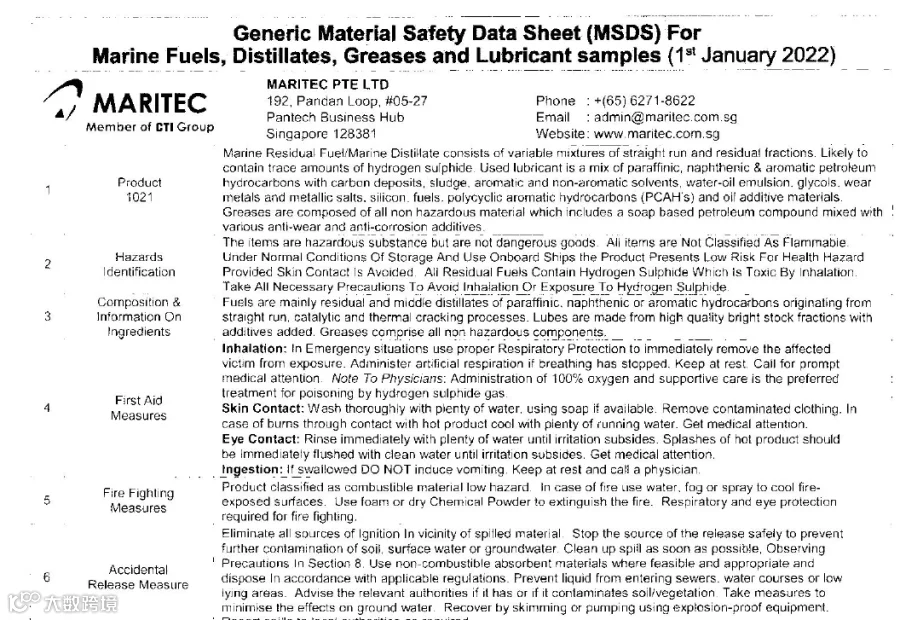 应尽快通过代理送实验室检测,项目包括硫含量、密度、闪点、酸值(TAN)、沉淀物等[k]。