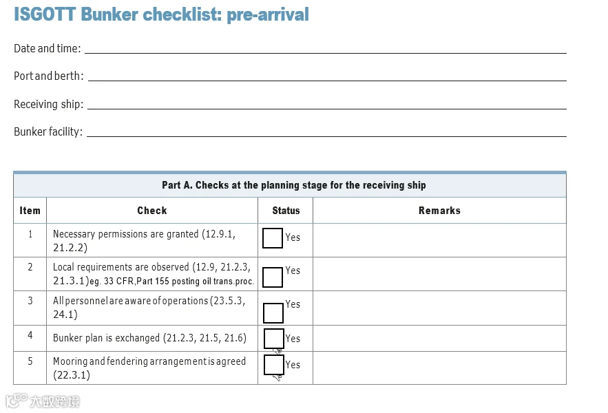 确认加油管路已完成12个月内压力测试,高位报警装置和应急切断系统(ESD)功能正常。消防与防污染设备(如灭火器、泡沫系统、围油栏、吸油材料)须到位。准备《加油checklist》《MARPOL合规检查表》《预加载计划》及供应商提供的《MSDS》和《BDN草稿》,确保含硫量、密度等关键数据清晰准确[k]。