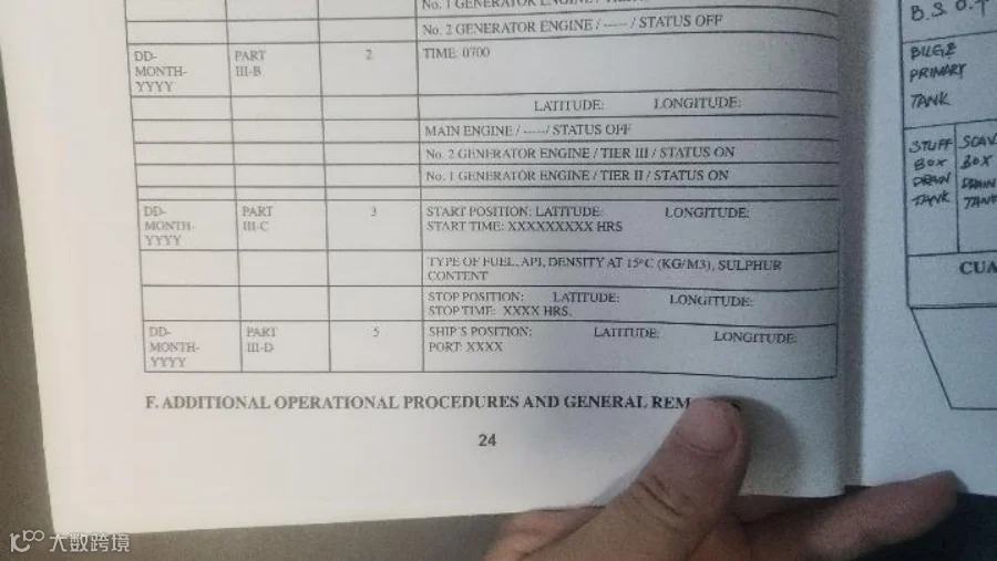 须在《燃油硫含量记录簿》中登记进出ECA的时间、位置、换油完成时间、各油舱燃油量及硫含量,并由轮机长签字确认[k]。