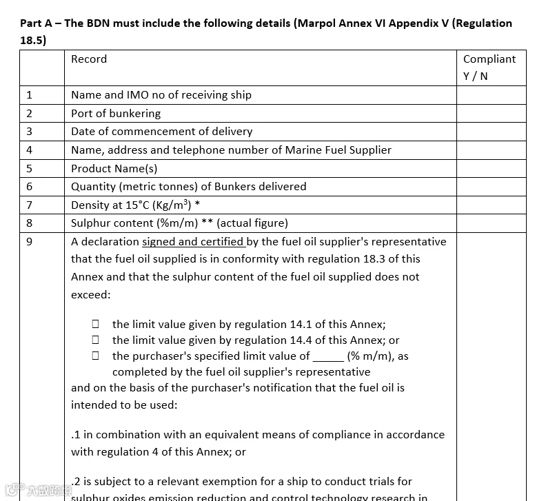 需核查《BDN》必填项:船名、IMO编号、加油港、日期、供应商信息、油种、数量、密度、硫含量、供应商合规声明及采样铅封号[k]。