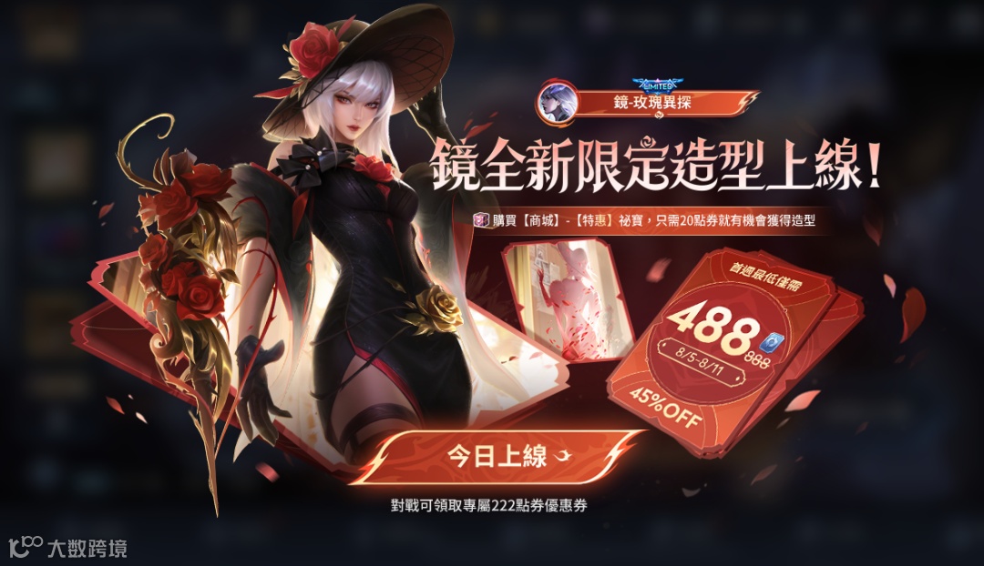 🌹今日(8月5日)參與一把對局就送【222點券專屬優惠券】,疊加首週折扣後,折上折僅需488點券!喜歡的玩家千萬別錯過~