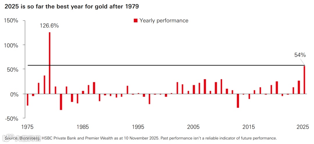 过去半个世纪,黄金的年度涨幅真正“惊世骇俗”的年份屈指可数:1979 年涨幅超过一倍,成为教科书里都会被单独拎出来的一年。