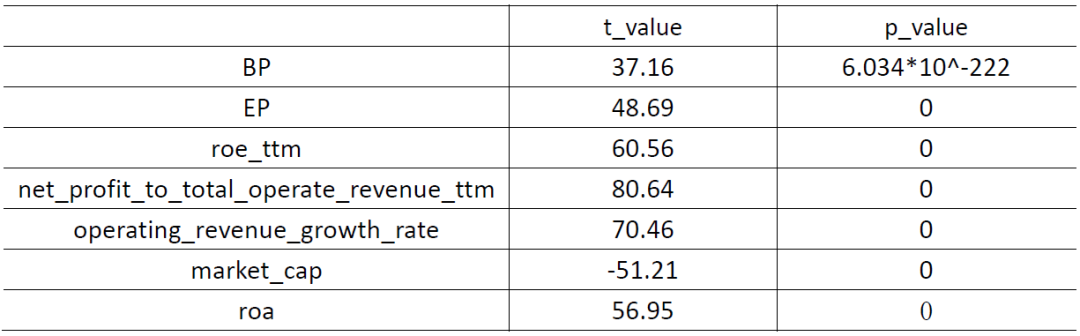 其中SE(a^T)代表回归系数a^T的标准差的无偏估计量。一般t值绝对值大于2我们就认为本期回归系数a^T是显著异于零的(也就是说,本期因子X对下期收益率具有显著的解释作用)。注意,我们在回归模型中加入了市值、行业因子,能在一定程度上规避市值、行业因素对财务质量因子的影响。
