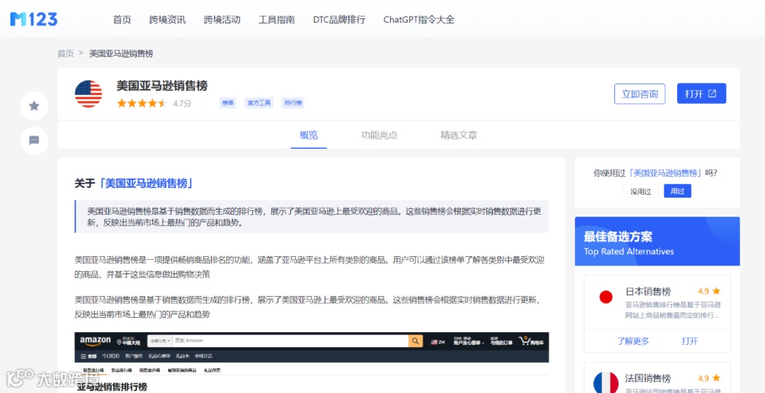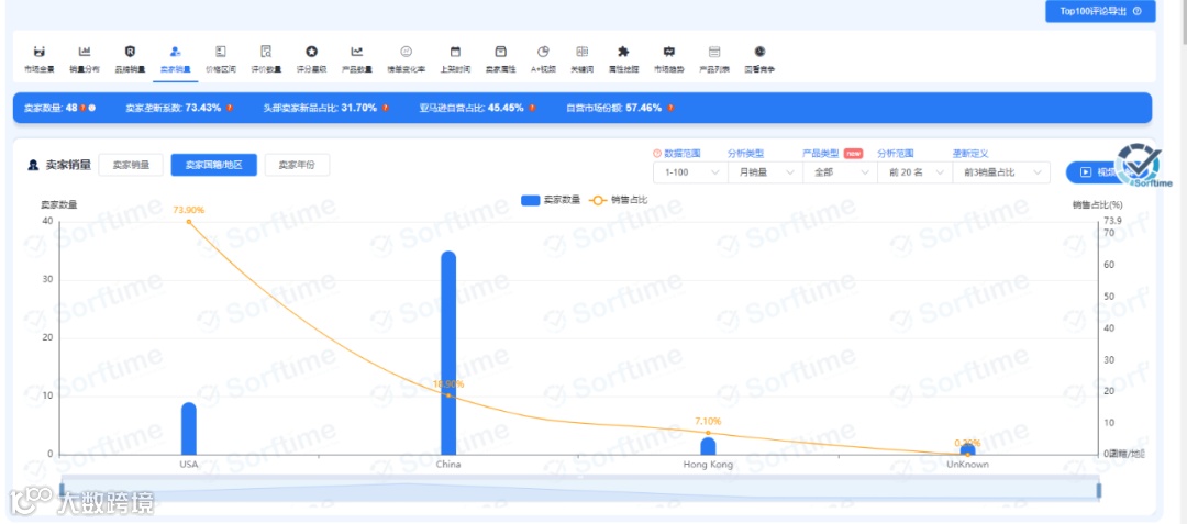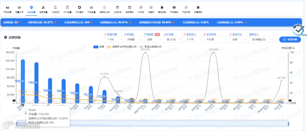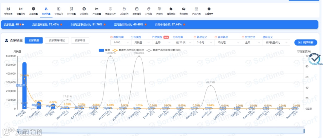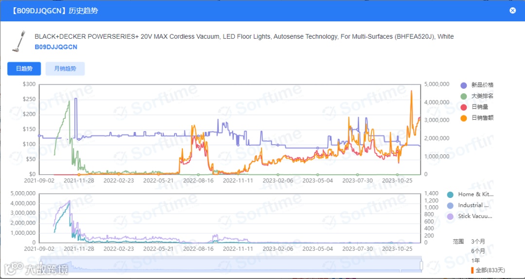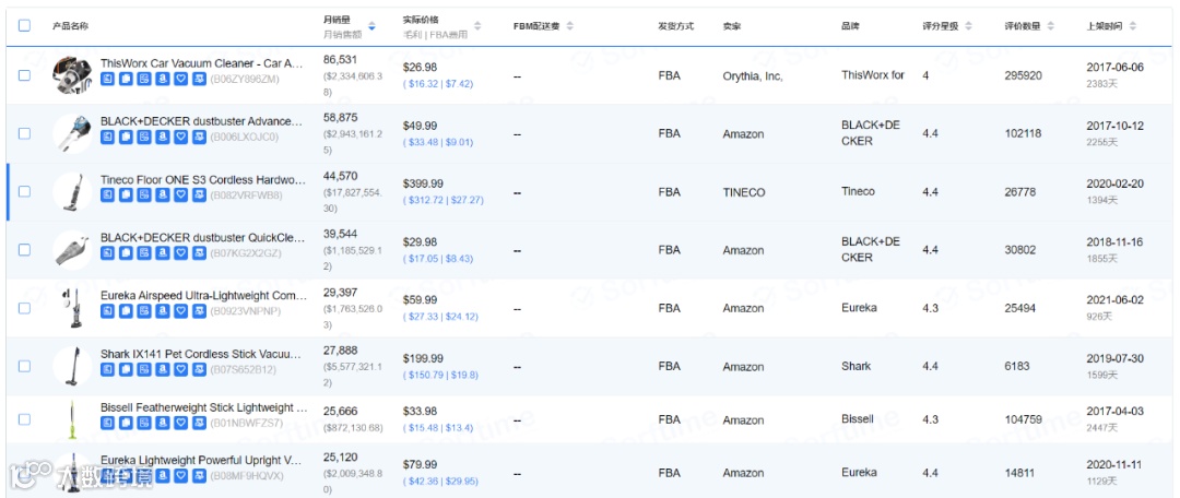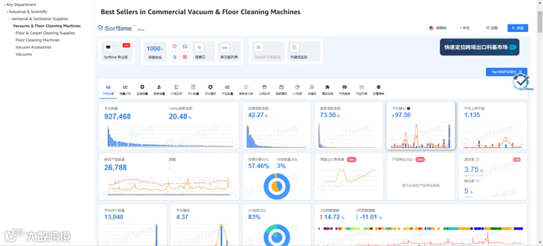 进入排行榜后,我们找到自己所在行业的分类,我们以工业于工业科学-清洁卫生用品-真空吸尘器地板清洁机的类目为例。这个排行榜单中,我们可以看到月销量927468,平均售价(美金):97.5元,类目产品数量:26788个,直营比例:57.46%,FBA份额:96.71%等各种数据,在这些数据里,应该关心几个比较重要的数据:品牌销量、卖家销量、卖家国籍、评价数量,这就是类目选品原则:避开亚马逊直营、中国卖家多、买家对评价不敏感的类目、不要有巨头品牌