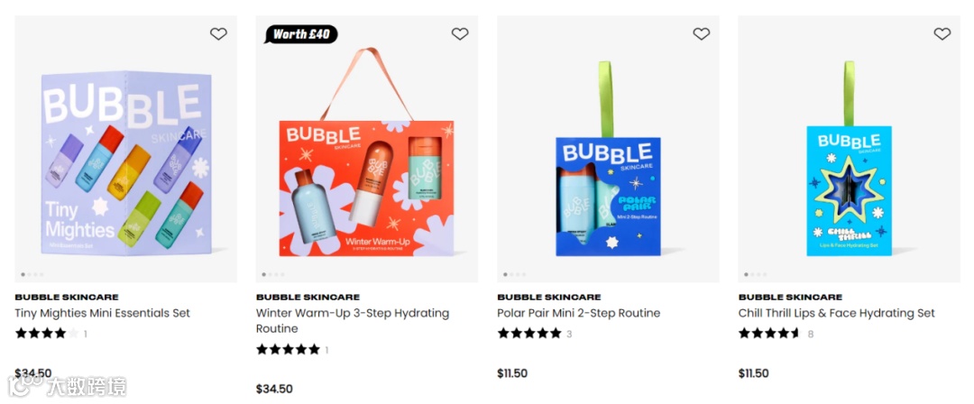 Bubble Skincare搭建海外独立站,推出洁面乳、爽肤水等全面产品线,单品售价均在20美元以下。首次购买用户可享10%优惠折扣,同时提供护肤套装以简化购买决策过程。