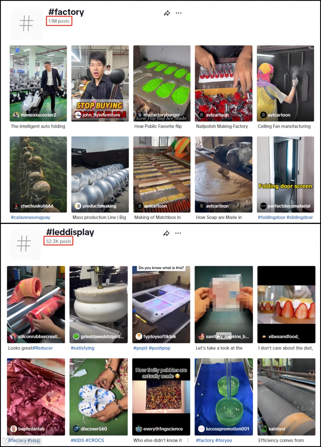 TikTok上的#factory和#leddisplay标签分别拥有超过110万和5.23万的帖子数,显示了此类内容的巨大受众市场。亿格创通过展示解压类视频内容,如屏幕拼装过程,吸引了大量用户关注。