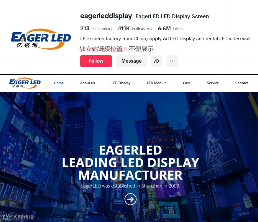 亿格创成立于2009年,是一家专业研发、生产与销售LED显示器及模组的厂家,其TikTok账号@eagerleddisplay已积累近50万粉丝,单条视频最高播放量突破1.41亿[SEO关键字:TikTok出海营销]。