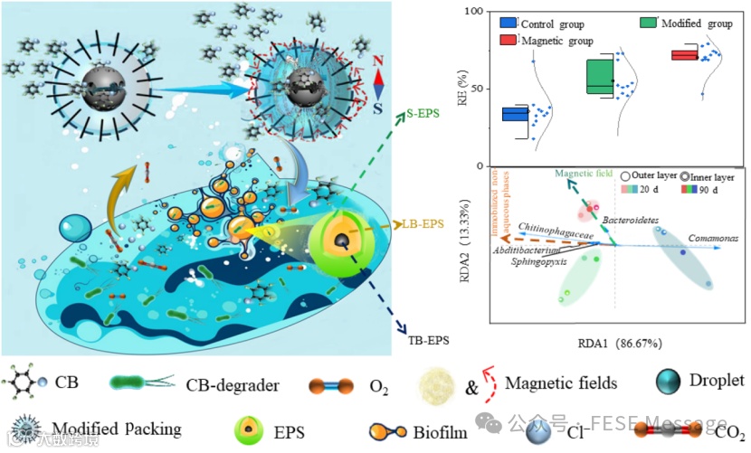 Enhanced gaseous chlorobenzene removal and its microbial mechanism through innovative modified packings coupled with magnetic field in a biotrickling filter
