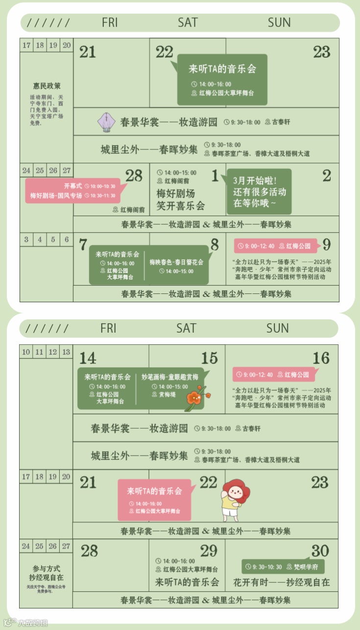 本届梅花游园生活季将天宁胜境景区--红梅公园、天宁禅寺、天宁宝塔,通过一条主线、多套活动的多点位联动方式,全方位展示老城厢的自然风光、人文历史和民俗风情。