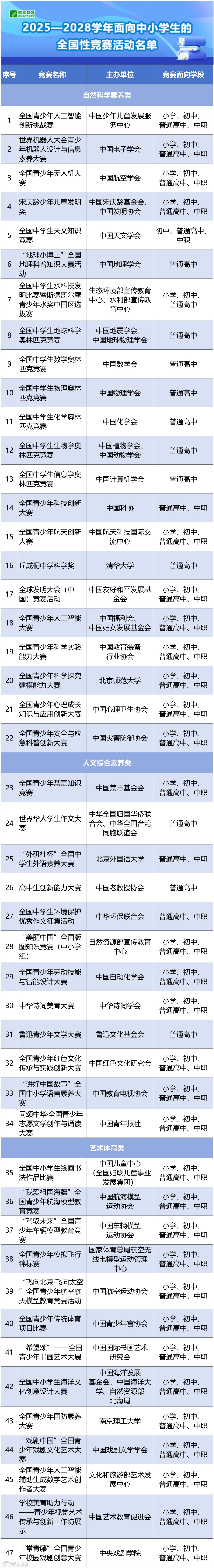 相关阅读☞ 教育部重磅发布!2025-2028年全国中小学生竞赛白名单公示!增至47项,这16项首次出现,还有这些已悄然离席