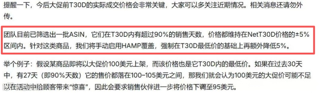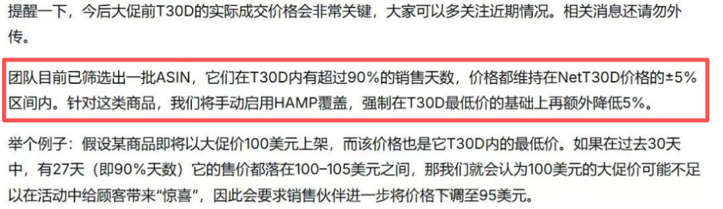 举例来说,某商品30天最低价为100美元,且30天中有27天售价在100-105美元之间,系统会认为100美元的大促价缺乏竞争力,强制要求降至95美元。