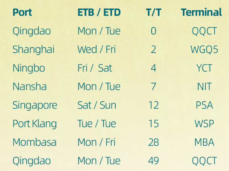 等中国出口港,船期高效直达东非蒙巴萨。同时,东北亚、东南亚地区的货物亦可通过其近洋航线,中转衔接MFX航线运达蒙巴萨。