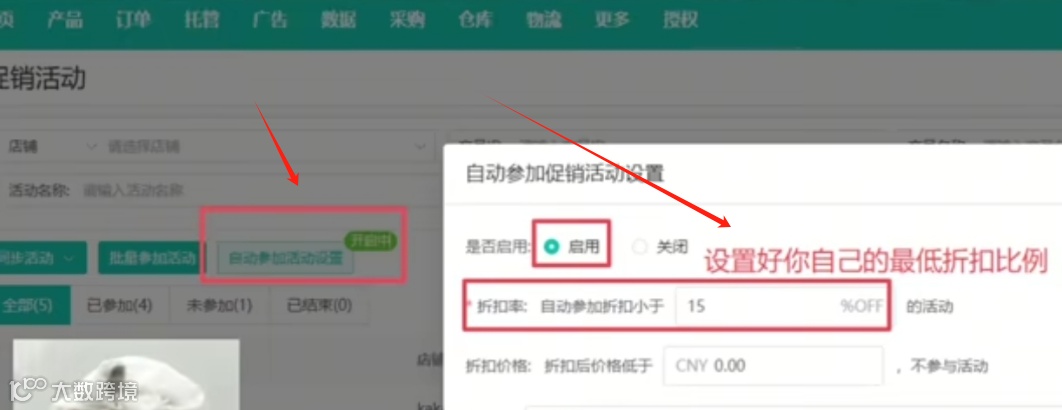 开启“自动参加活动”限制功能,并设置最低折扣百分比