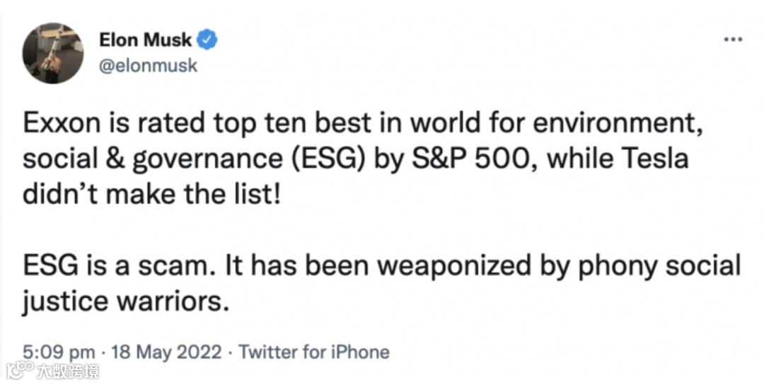 马斯克曾在推特上公开抨击,“ESG是魔鬼的化身。”“ESG是一个骗局。它已被虚假的社会正义战士武器化。”