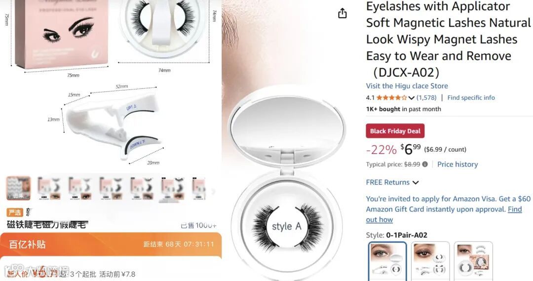 对跨境卖家而言,比起市场热度,磁吸假睫毛在海内外的价差更值得关注。国内某批发平台上一对只要6-7元的磁吸假睫毛,在亚马逊上差不多的款式最低能卖到6.99美元,翻了七倍有余。