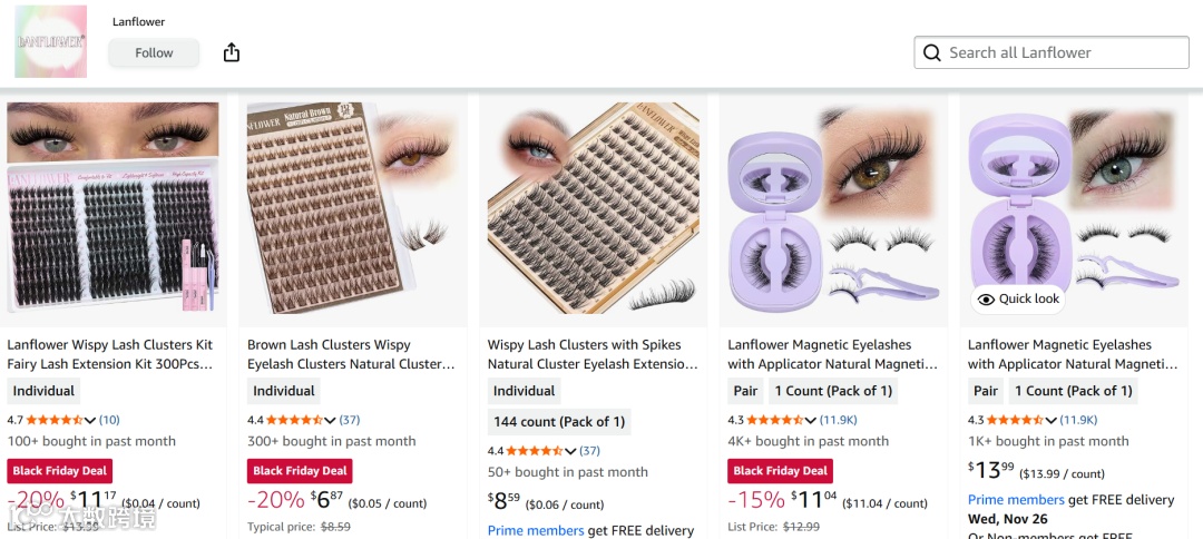 Lanflower是一家专门做假睫毛的店,店里另一款产品是单簇假睫毛。该品牌有做传统睫毛的基础,磁吸假睫毛是对其原有产品的创新。品牌依靠过关的质量和先前积累的口碑,在新兴的磁吸假睫毛市场也占据了一定的份额。