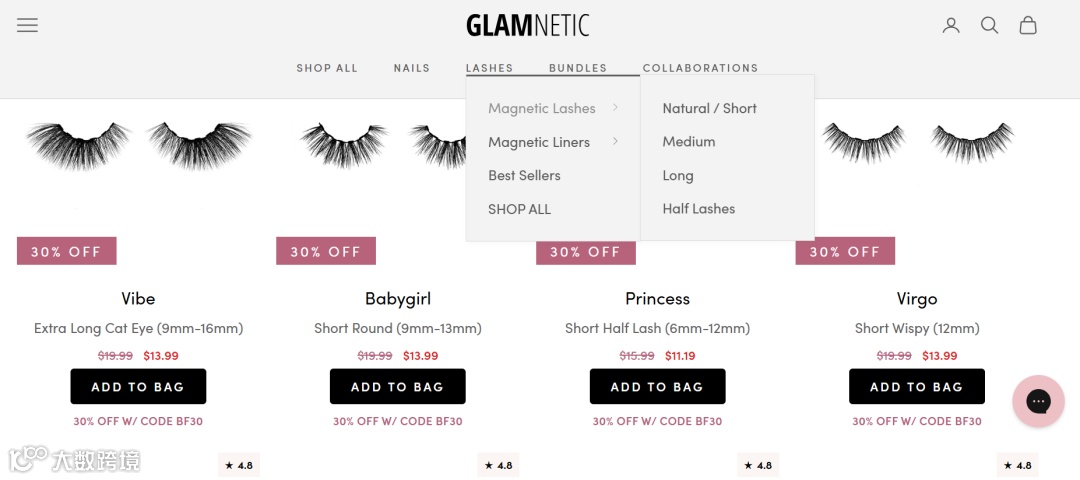 尽管Glamnetic现在的主要业务不再集中于磁吸假睫毛,但也有值得借鉴之处。品牌官网首页各项功能标注明显,分类清楚,连睫毛长短都标明了,方便浏览者快速找到需要的产品。根据假睫毛的形状特点来命名,“Babygirl”、“Princess”等名称极具少女心,吸引着追求潮流的女孩们。