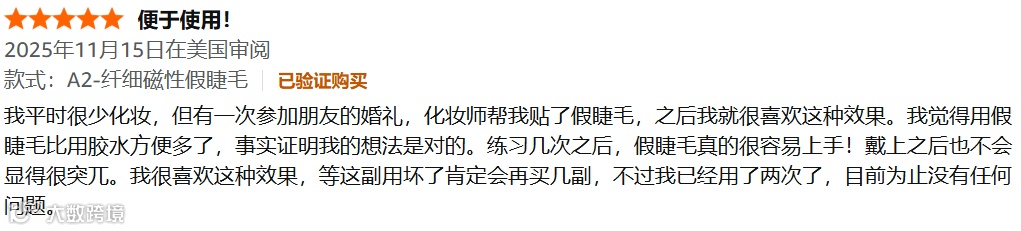 欧美消费者对创新美妆产品的接受度较高,通常也乐意用钱买方便,所以愿意用较高的价格购买。亚马逊上销量最高的Lanflower磁吸假睫毛的评论区就有人表示,喜欢假睫毛的效果但又不想用胶水,于是选择价格更高的磁吸假睫毛,能用最少的时间获得最好的变美效果。