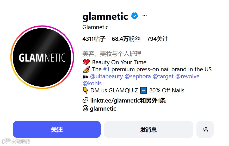 Ann拥有一定的美妆行业资源和粉丝基础,为了宣传自己的产品,邀请到一些模特朋友免费拍图,并在自己的账号上发布相关内容,慢慢积累了一批忠实用户。现在Glamnetic的Instagram账号粉丝有近七十万,远超Ann本人的粉丝量。