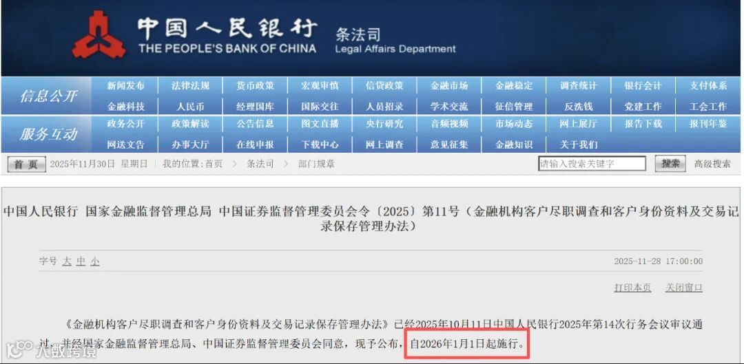 11月28日,中国人民银行正式发布《金融机构客户尽职调查和客户身份资料及交易记录保存管理办法》,明确自2026年1月1日起,单笔金额达到人民币5000元或等值外币1000美元以上的境外汇款,须进行汇款人身份核实。