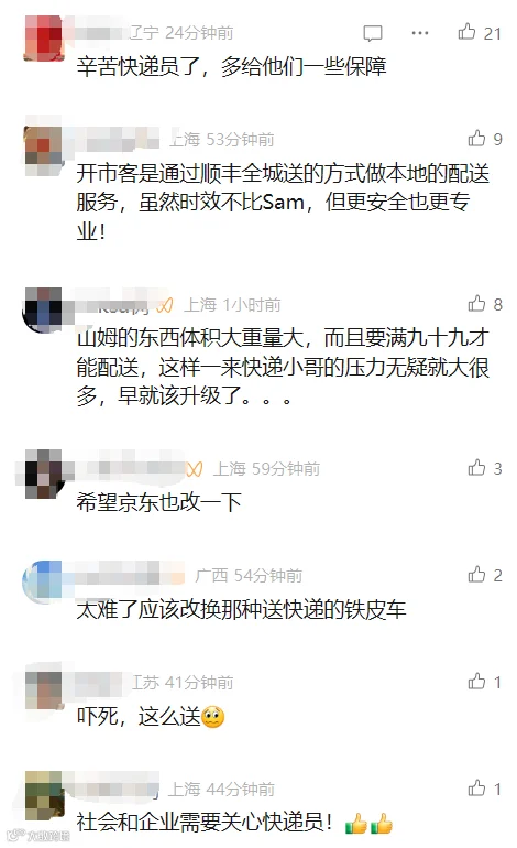 据称,近期天津、武汉、长沙等地的山姆超市已与顺丰、京东合作,用电动三轮车运输大件货物。
