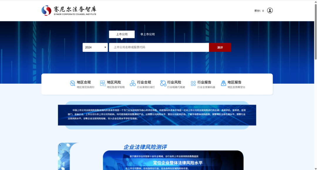 该数据库为公司法律合规风险进行体检的产品,是对公司法律合规工作做出的一个比较直观的评价。公司法律合规风险值比较高,说明法律合规工作需要注意加强一下,防止出问题。公司法律合规风险值相当高,通常是公司已经出了问题,需要整改避免再次出问题。公司法律合规风险值很高,那很可能说明公司的生存要出问题了。体检的指标分为六大类,十六个具体指标。十六个具体指标用一个数学模型计算后得出一个总体分值。分值越高,说明法律合规风险越高; 分值越低,法律合规风险越低。