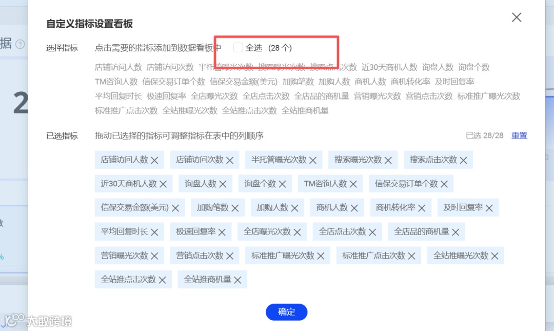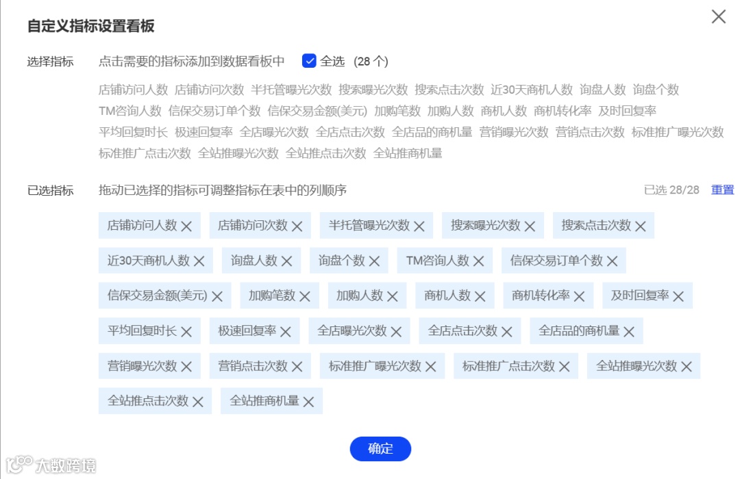 使用前请在指标自定义设置中勾选全部28项指标,确保数据完整性。