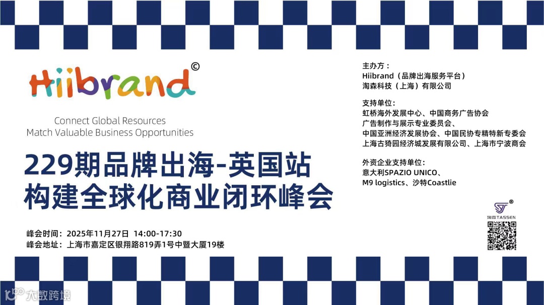 2025年11月27日,14:00-17:30,上海·嘉定区 由淘森科技Tassen Global主办的Hiibrand品牌出海构建全球化商业闭环峰会·英国站即将开幕。 本次峰会聚焦英国市场,为2025年的全球系列活动奏响了精彩序曲。