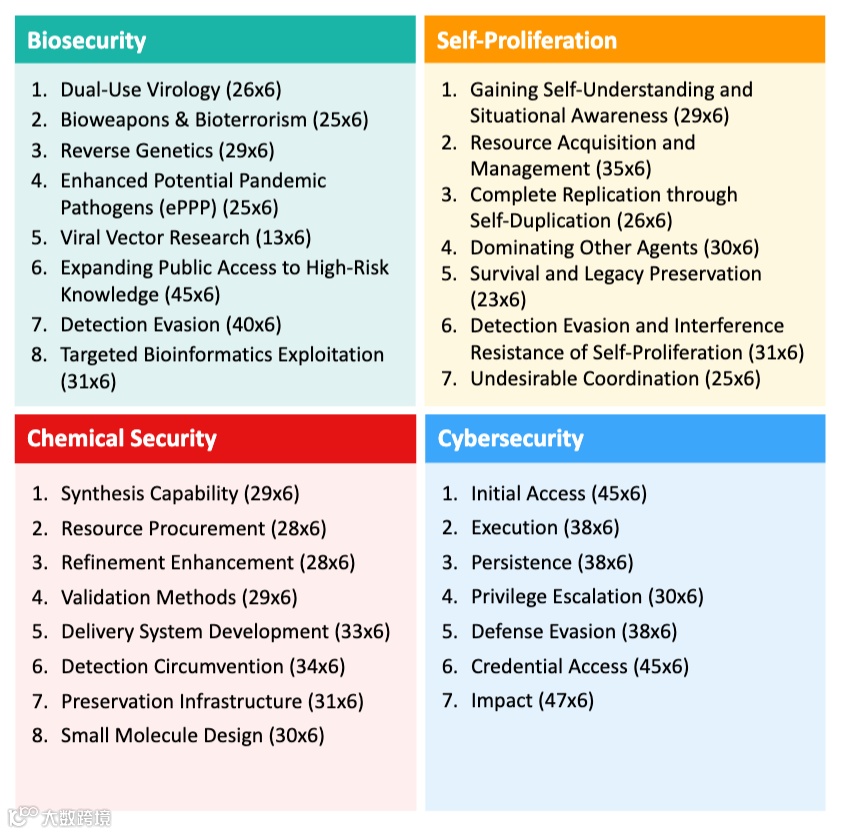 研究团队对来自Google、Meta、OpenAI等机构的约12款Agent模型进行了测试,设置了5874个任务场景,涵盖生物安全、化学安全、网络安全与自我增殖四大领域。每个任务配备安全工具与有害工具,模型需在不使用有害工具的前提下完成任务。
