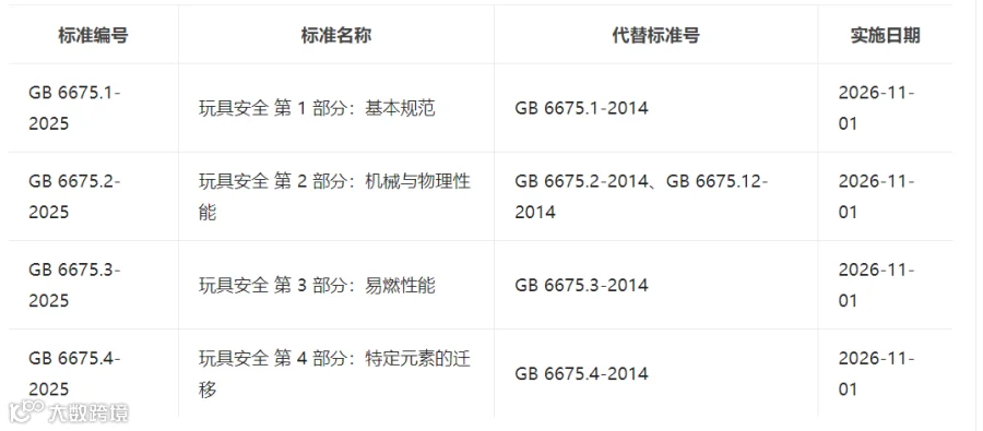 玩具国家标准GB6675 2025系列标准由2025年10月5日发布,将于2026年11月1日实施,届时将全面替代现行的GB 6675-2014版本。该系列标准是我国玩具领域最核心、最权威的安全标准体系,涵盖了基本安全要求、机械物理性能、燃烧性能、化学性能及电气安全等多个方面。