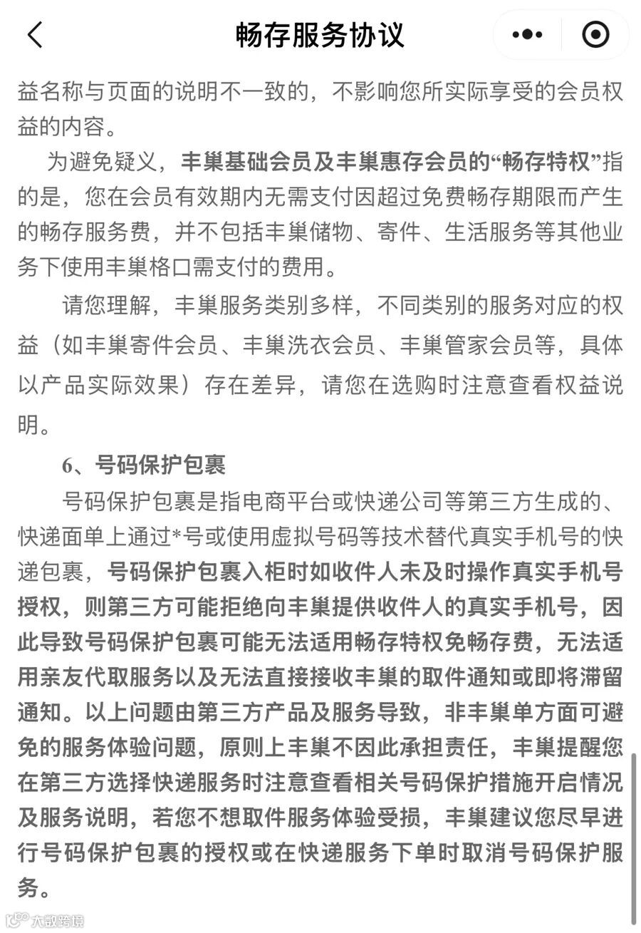 记者查询发现,丰巢在《畅存服务协议》中确有“号码保护包裹”的相关取件费用规定:如收件人未及时操作真实手机号授权,则第三方可能拒绝向丰巢提供收件人的真实手机号,可能导致无法适用畅存特权免畅存费,无法适用亲友代取服务以及无法直接接受丰巢的取件通知或即将滞留通知……