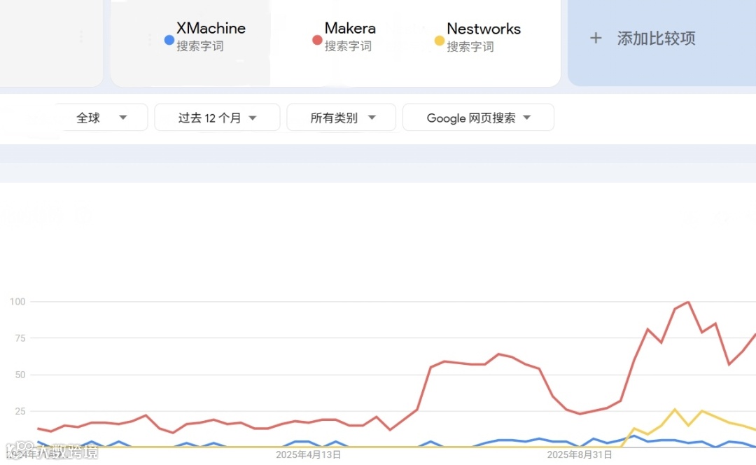 我们看下XMachine、Makera和NestWorks的谷歌搜索热度,Makera明显领先。