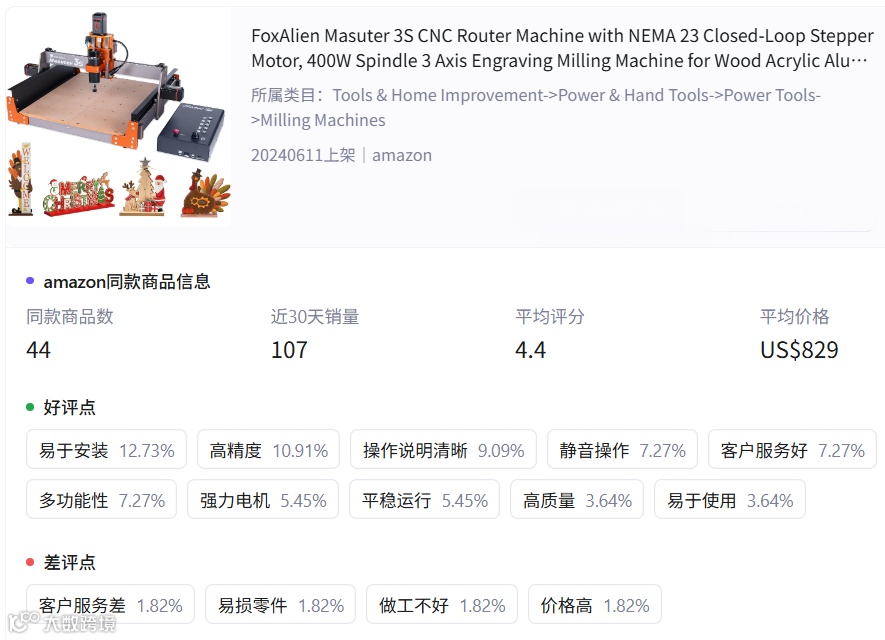 以亚马逊美国站的数据为例,桌面CNC赛道的核心特征是“高单价、低销量、高分散”。平均售价高达$2200,但月销量不足百台,且没有任何品牌能占据主导地位。这为有技术、有品牌、有服务能力的新卖家提供了进入窗口。