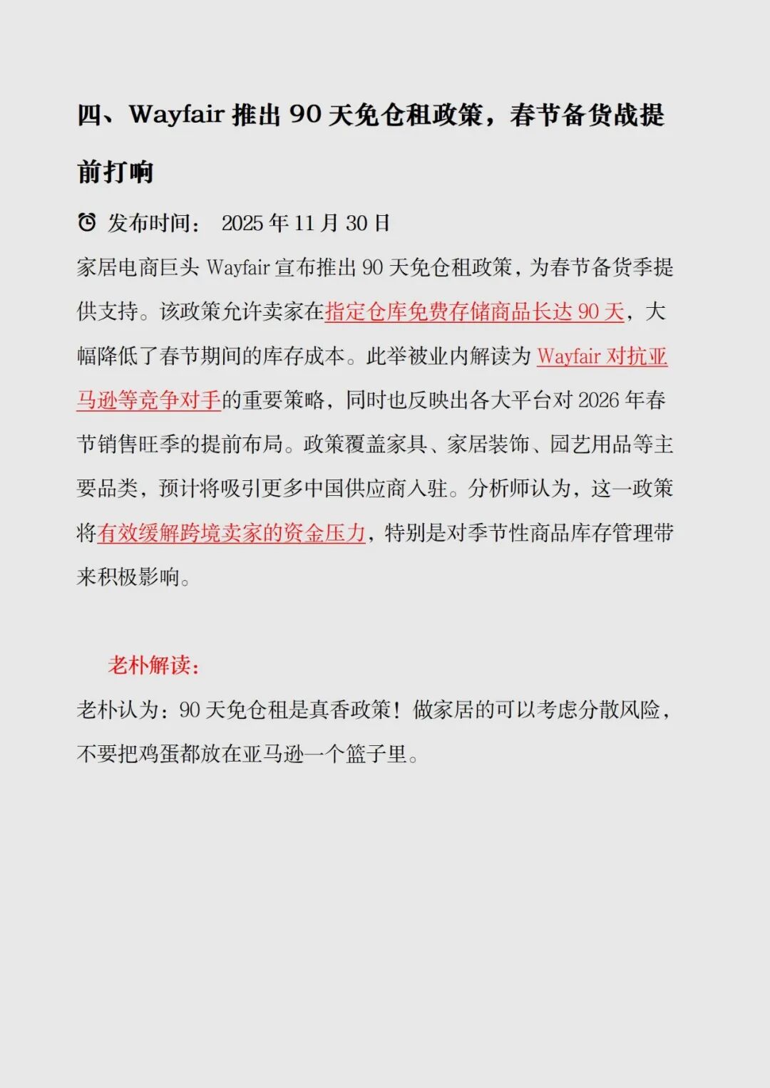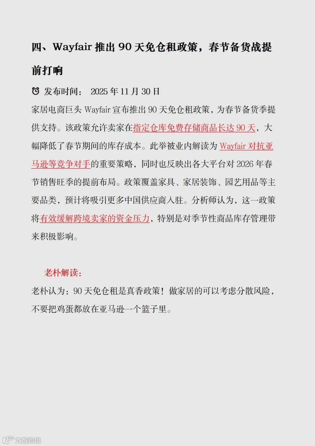 这明显是Wayfair在搞**“春节备货战”**。 咱们中国卖家最怕什么?最怕春节期间工厂停工,断货! 所以必须在年前把大货发出去。但发早了,国外的仓储费贵得要死。