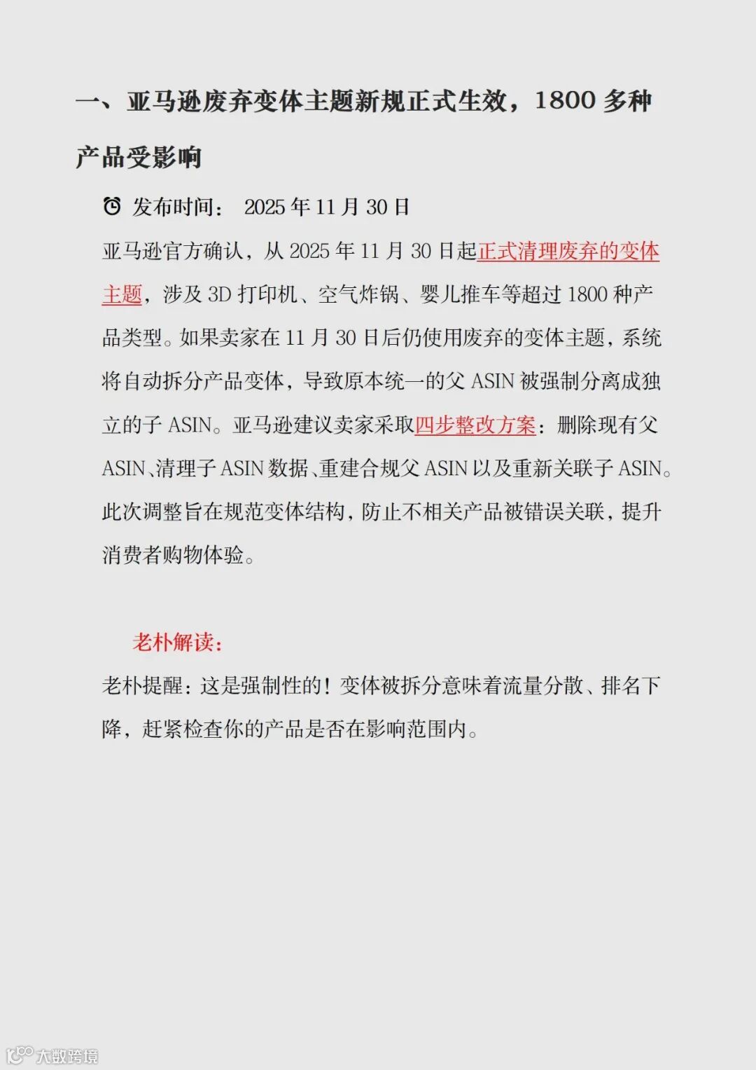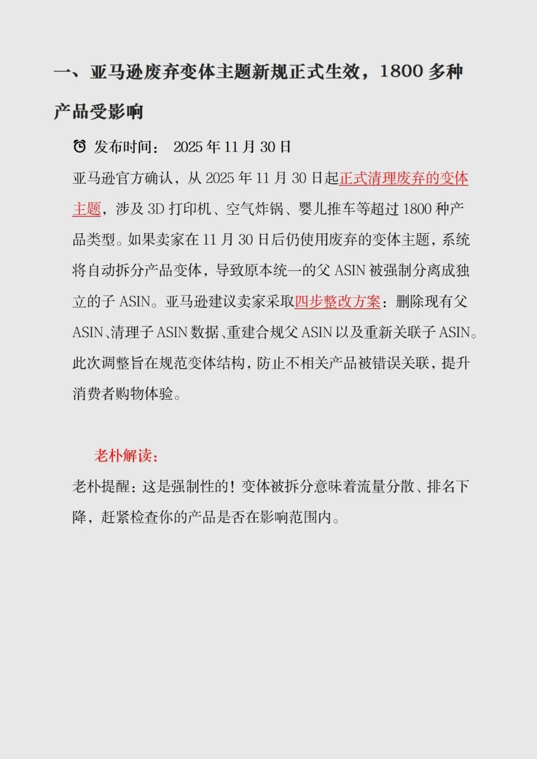 昨天是个分水岭。 针对1800多种产品(空气炸锅、婴儿推车这些大类都在里面),如果你还在用那些“废弃的变体主题”强行合并Listing,亚马逊系统会自动把你的变体拆散。