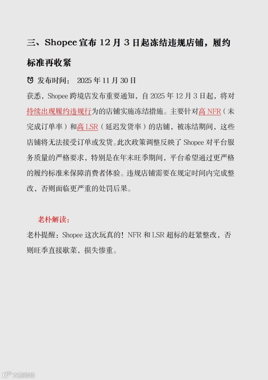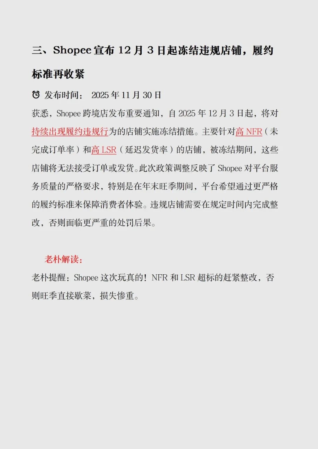 12月3日,也就是后天。只要你的NFR(未完成订单率)和LSR(延迟发货率)超标,店铺直接冻结。