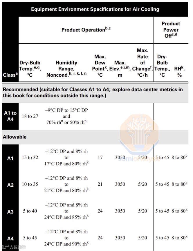 过去十年间,数据中心运营商逐渐采用更高进风温度(远高于22°C),发现这并未影响IT设备寿命。美国暖通空调学会(ASHRAE)的下表显示,其建议服务器干球温度(即空气温度)维持在18°C至27°C。然而允许超过30°C,某些情况下空气温度甚至可设定高达45°C——尽管"A4"级服务器更多用于军事类应用。