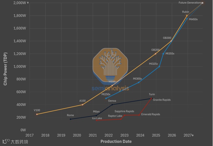 热传导始于数据中心机房,IT设备耗电直接产生热能——驱动IT设备的每千瓦电力约产生等量热能。芯片制造商通过热设计功耗(TDP)界定芯片或系统的最大发热量,为热工程师设计冷却方案提供依据。过去5-10年间,芯片TDP持续攀升。随着AI加速器的普及,这一趋势愈发陡峭,1500W芯片将于明年量产。