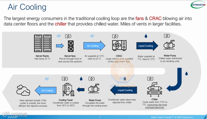 • 在多数地区,将冷却水降温至7°C需要消耗大量电力(主要用于冷水机制冷循环)。如此低的冷冻水温度源自办公楼宇或商业HVAC系统。将水冷却至此低温的能源成本远超降低服务器风扇转速带来的节能量