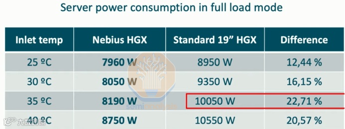 服务器风扇可能消耗显著电能,这促使超大规模运营商设计定制服务器而非采购戴尔或超微等厂商的现成方案。拥有超大规模资源的新锐云服务商Nebius近期数据展示了定制服务器设计如何降低能耗。